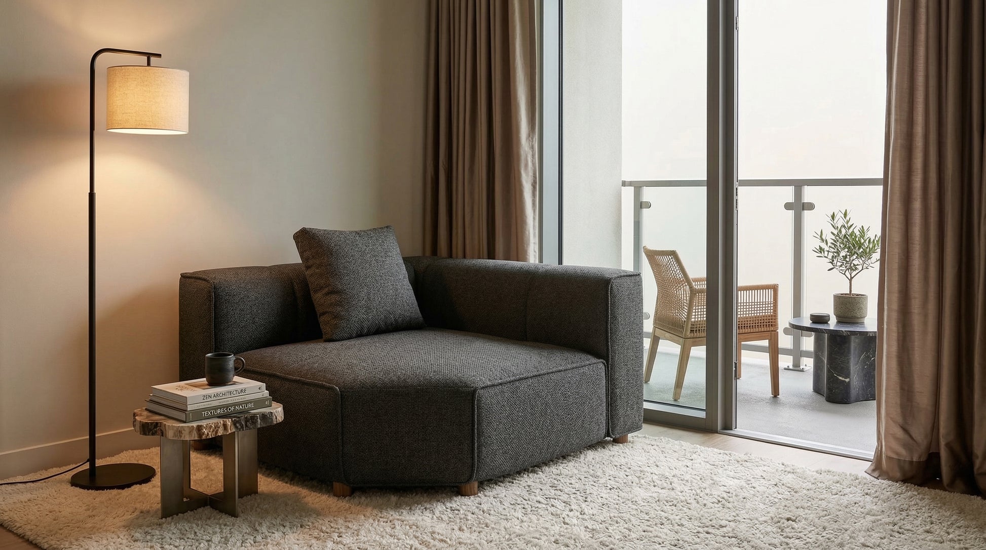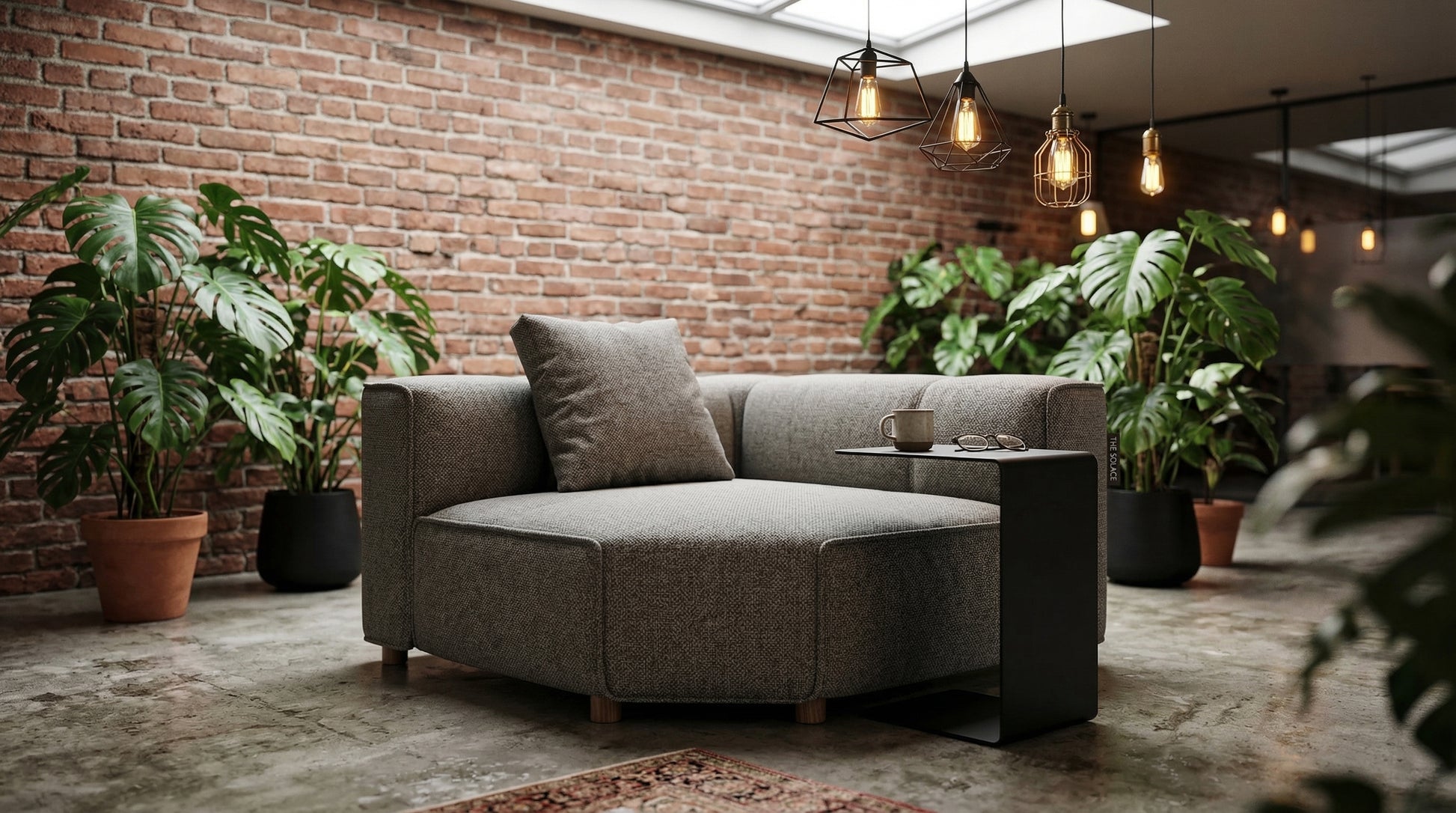 A Sanctuary of Modern Comfort Designed for versatility and deep relaxation, The Solace is a premium modular corner unit that brings a sense of grounded luxury to any space. Whether used as a standalone statement piece or as part of a larger custom sectional, its bold, low-profile silhouette and charcoal gray upholstery offer a sophisticated aesthetic for modern interiors.
